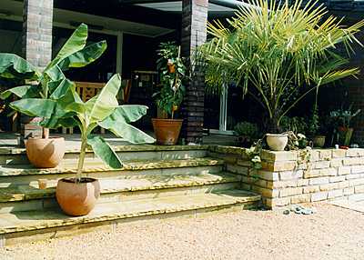 Der Zugang zur dem überdachten Teil der Terrassenanlage. Mauern und Stufen sind aus Sandstein gefertigt.