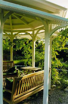 Der Pavillon ist mit Blauregen bepflanzt.Im Hintergrund an der Terrasse ist ein Blumenhartriegel erkennbar. Und dann die Buchskugeln, die in dem gesammten Garten plaziert wurden und so helfen die Bereiche nahtlos inneinander übergehen zu lassen.