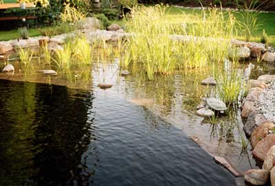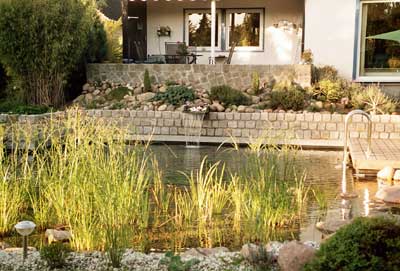 Das Wasser fällt als Vorhang mit sehr angenehmen Geräusch in den Schwimmbereich. Die Höhendifferenzen wurden mit Natursteinmauern abgefangen. Eine sehr reizvolle Kombination der Materialien.